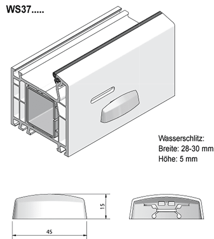 GKG Wasserschlitzkappen WS 37.... • optisch harmonische Form • einfache Klemmmontage • Windstop gegen unangenehmes Pfeifen bei Starkwind • farb- und witterungsbeständig • Profilwandstärke 2,8 - 3,6 mm • großes Farbsortiment sofort ab Lager lieferbar • Material: ASA • Wasserschlitz: Breite: 28-30 mm Höhe: 5 mm Systeme: Aluplast, Brügmann, Inoutic, KBE, Kömmerling, Rehau, Salamander, Schüco, Trocal, Veka