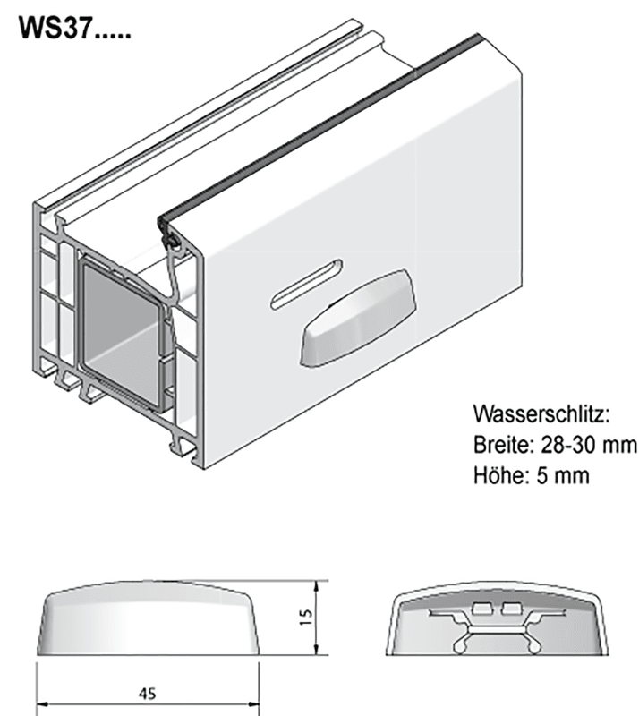 GKG Wasserschlitzkappen WS 37.... • optisch harmonische Form • einfache Klemmmontage • Windstop gegen unangenehmes Pfeifen bei Starkwind • farb- und witterungsbeständig • Profilwandstärke 2,8 - 3,6 mm