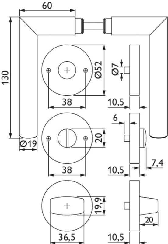 Bad-Drückergarnitur 1231 R MOON, mit Rosetten 2036 KB, Ausf.: BAD mit Riegel 3212/3216 - 6 mm Vierkant, mit Hülse 7/8 mm, Türstärke 38 - 42 mm, Oberfl. 18 (PVD Messingfarben)