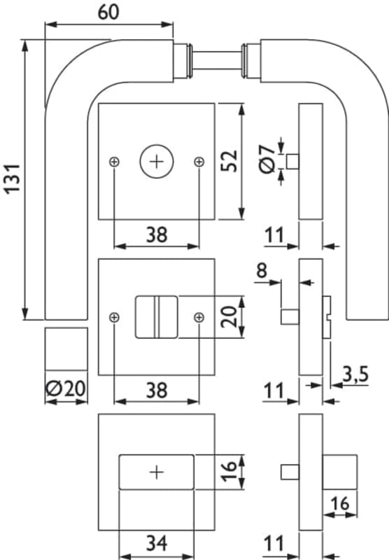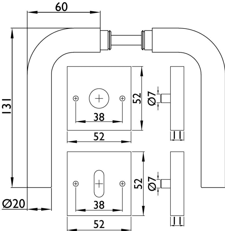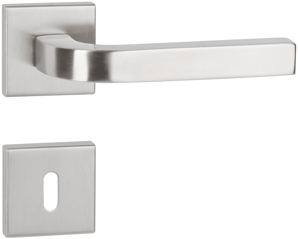 Bad-Drückergarnitur 1803 K BASIC 03, mit Rosetten 2011 KD - mit Rückholfeder, Ausf.: BAD, mit WC-Riegel 3220/3225, 6 mm Vierkant, mit Hülsen 7/8 mm, Türstärke 38 - 42 mm, Oberfl. 60 (Edelstahl matt)