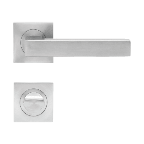 Drückergarnitur mit Türdrückermodell ER46Q Seattle, für Standardtüren nach DIN EN 1906, Gebrauchskategorie 3. Eigenschaften: • 3-teiliger Schraubrosette quadratisch • Gleitlager aus Nylon • fest dreh