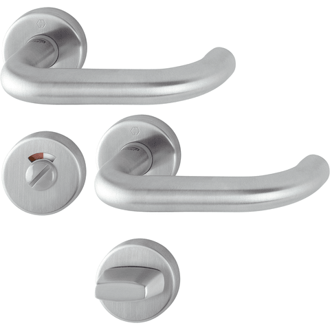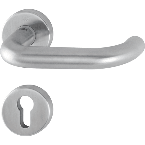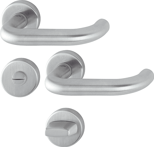 HOPPE-Edelstahl-Rosetten-Türgriff-Garnitur mit Schlüsselrosetten für Innentüren: • geprüft nach DIN EN 1906: 37-0140A, Objekt-Garnitur • Lagerung: Türgriffe lose, Rückholfedern rechts/links verwendbar