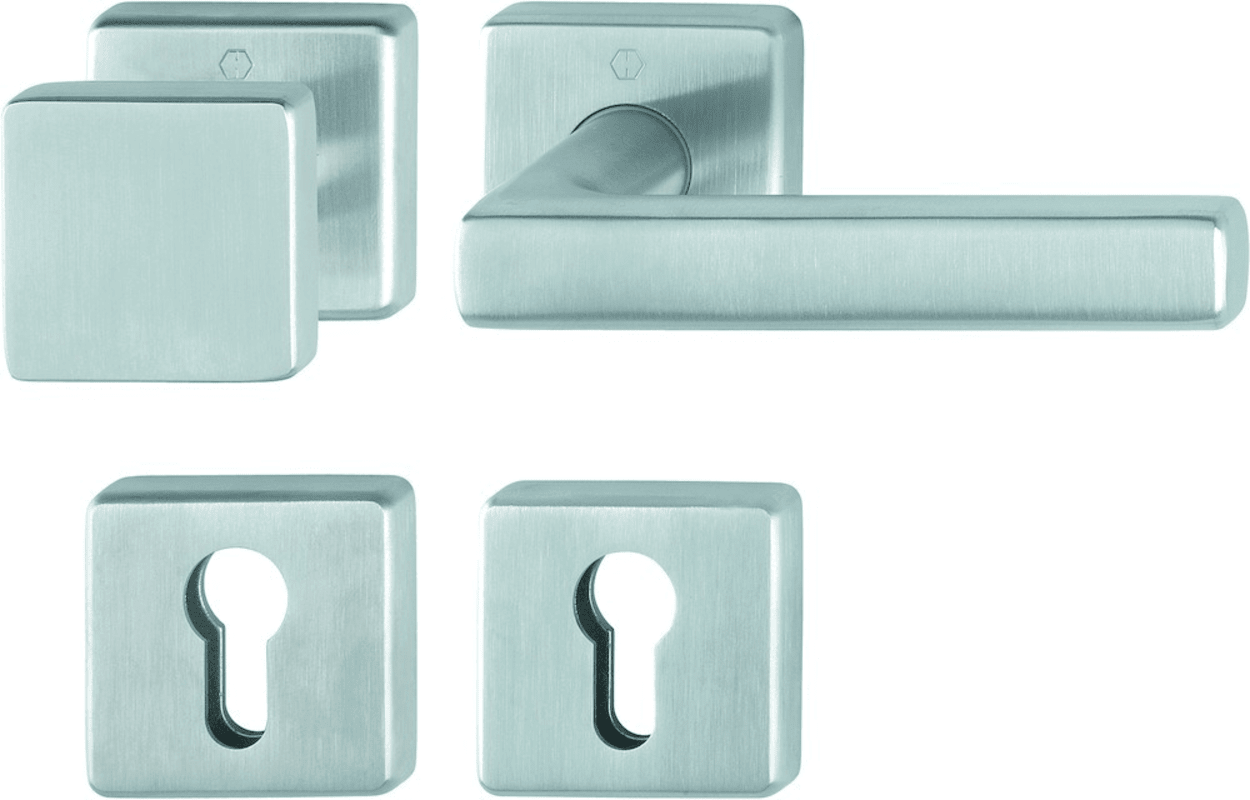 HOPPE® Wechselgarnitur Dallas FS-E43L/52/52S/1643; Material: Edelstahl; Befestigungsart: verdeckt verschraubt; Befestigungstechnik: mit Stütznocken; Vierkant: 9 mm; Befestigungssystem: Steckverbindung; Abdeckung: mit Rosetten; Lagerung: Gleitlager,wartungsfrei,festdrehbar,Rückholfeder,Sertos®; Form: eckig; Benutzerklasse: Klasse 3; Einsatzbereich: Feuerhemmend; Basis: Wechselgarnitur; Lochung: Profilzylinder gelocht; Türstärke min.: 40 mm; Türstärke max.: 65 mm; Norm: DIN 18273,DIN EN 1906; Zulassung: für Feuerschutz,für Rauchschutz; DIN-Richtung: DIN Links-Rechts; Breite: 52 mm; Länge: 52 mm; Farbton: edelstahl matt; Türart: Außentüren; Drückerbefestigung: Wechselstift mit Rolle; Anschlagrichtung: Drücker rechts/links verwendbar; Eigenschaft: Knopf fest auf Rosette; Knopfhöhe: 32 mm; Türwerkstoff: Holz,Aluminium,Stahl; Material Unterkonstruktion: Stahl; Drückerhöhe: 55 mm; Drückerlänge: 131 mm; Drückerbreite: 21 mm; Knopfform: eckig; Stärke Abdeckung außen: 10 mm; Stärke Abdeckung innen: 10 mm; Knopfbreite: 48 mm; Drückerform: gerade