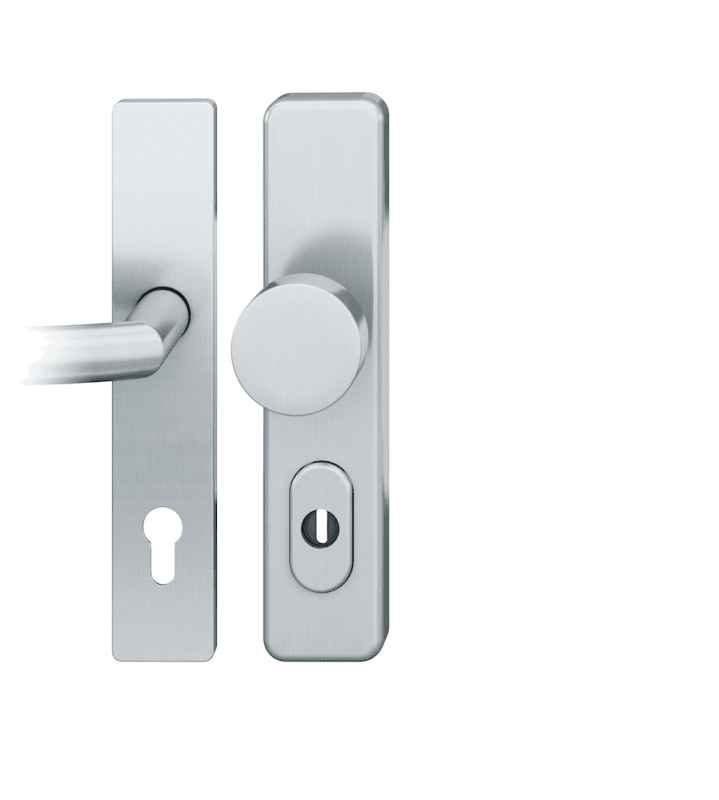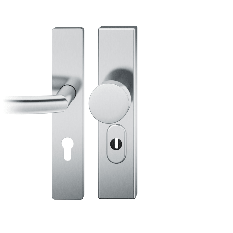 FSB, Wohnungseingangstür-Schutz-Wechselgarnitur, Abdeckung: mit Langschild,Modellnummer: 73 7376, Lochung: Profilzylinder gelocht, Entfernung: 72mm, Vierkant: 8mm, Material: Edelstahl, Farbton: edelstahl, Oberfläche: fein matt, DIN-Richtung: DIN Links-Rechts, Befestigungsart: durchgehend verdeckt verschraubt, Befestigungstechnik: mit Stütznocken, Befestigungssystem: Stiftverbindung, Ergänzung: mit Zylinderabdeckung, Eigenschaft: Knopf fest auf Schild, Schildbreite außen: 54mm, Schildbreite innen: 45mm, Schildlänge außen: 246mm, Schildlänge innen: 245mm, Knopfhöhe: 44mm, Knopfdurchmesser: 50mm, Anschlagrichtung: Drücker rechts/links verwendbar, Drückerbefestigung: Stabil-Wechselstift mit Rolle, Form: eckig, Schildstärke außen: 15mm, Schildstärke innen: 7mm, Türstärke min.: 38mm, Türstärke max.: 42mm, Türart: Abschlusstüren,Türwerkstoff : Holz, Stahl, Benutzerklasse: Klasse 4, Widerstandsklasse: SK2, Norm: DIN 18257, DIN EN 1906