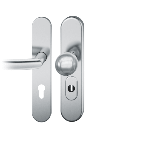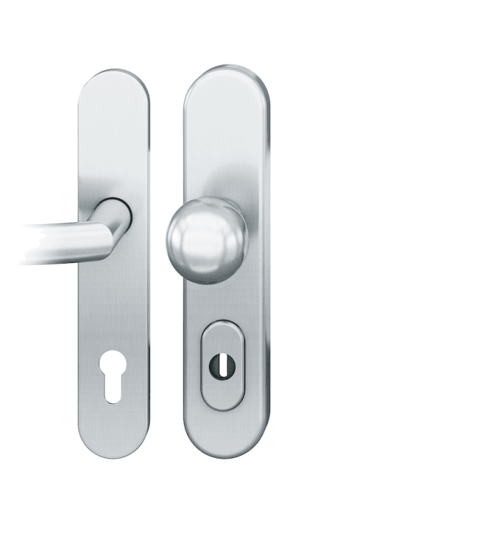 FSB, Wohnungseingangstür-Schutz-Wechselgarnitur, Abdeckung: mit Langschild,Modellnummer: 73 7375, Lochung: Profilzylinder gelocht, Entfernung: 72mm, Vierkant: 8mm, Material: Edelstahl, Farbton: edelstahl, Oberfläche: fein matt, DIN-Richtung: DIN Links-Rechts, Befestigungsart: durchgehend verdeckt verschraubt, Befestigungstechnik: mit Stütznocken, Befestigungssystem: Stiftverbindung, Ergänzung: mit Zylinderabdeckung, Eigenschaft: Knopf fest auf Schild, Schildbreite außen: 54mm, Schildbreite innen: 45mm, Schildlänge außen: 246mm, Schildlänge innen: 245mm, Knopfhöhe: 65mm, Knopfdurchmesser: 50mm, Anschlagrichtung: Drücker rechts/links verwendbar, Drückerbefestigung: Stabil-Wechselstift mit Rolle, Form: oval, Schildstärke außen: 15mm, Schildstärke innen: 7mm, Türstärke min.: 38mm, Türstärke max.: 42mm, Türart: Abschlusstüren,Türwerkstoff : Holz, Stahl, Benutzerklasse: Klasse 4, Widerstandsklasse: SK4, Norm: DIN 18257, DIN EN 1906