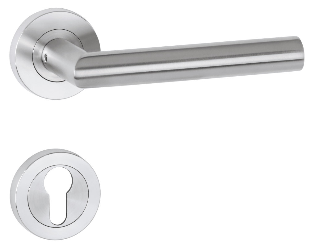 Drückergarnitur mit Schraubrosette, fest/drehbar mit Rückholfeder.