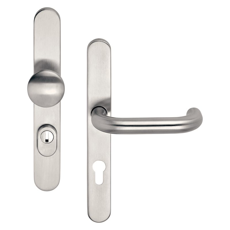 BKS Schutz-Wechselgarnitur RONDO B-75260; Material: Edelstahl; Befestigungsart: verdeckt verschraubt; Vierkant: 9 mm; Befestigungstechnik: mit Stütznocken; Abdeckung: Langschild; Lagerung: festdrehbar,wartungsfrei; Widerstandsklasse: ES 3 (SK4); Form: oval; Benutzerklasse: Klasse 4; Schildstärke innen: 9 mm; Einsatzbereich: Feuerhemmend; Basis: Schutz-Wechselgarnitur; Ausführung: mit Zylinderabdeckung,mit Drücker H1.0,mit Rundknopf K1.0; Lochung: Profilzylinder gelocht; Entfernung: 72 mm; Türstärke min.: 54 mm; Befestigungssystem: Stiftverbindung; Türstärke max.: 69 mm; Drückerbefestigung: Wechselstift; Norm: DIN EN 1906,DIN 18257,DIN 18273,DIN EN 179; DIN-Richtung: DIN Links-Rechts; Zulassung: für Feuerschutz,für Rauchschutz,für Notausgänge; Oberfläche: matt gebürstet; Eigenschaft: Knopf fest auf Schild; Farbton: edelstahl; Türart: Rahmentüren,Fluchttüren; Anschlagrichtung: Drücker rechts/links verwendbar; Türwerkstoff: Aluminium,Stahl; Schildbreite außen: 36 mm; Schildbreite innen: 32,7 mm; Schildlänge außen: 252 mm; Schildlänge innen: 252 mm; Drückerhöhe: 70 mm; Drückerlänge: 145 mm; Knopfform: rund; Knopfdurchmesser: 50 mm; Schildstärke außen: 15 mm; Knopfhöhe: 57 mm; Drückerform: U-Form; Drückerdurchmesser: 21 mm