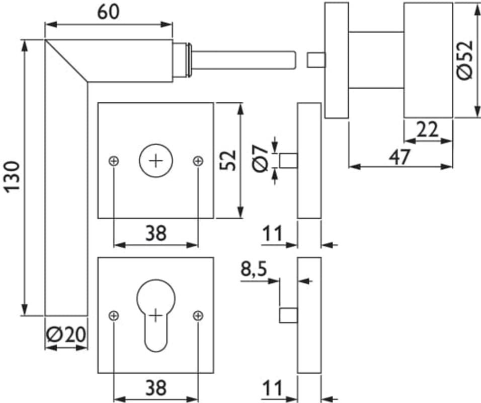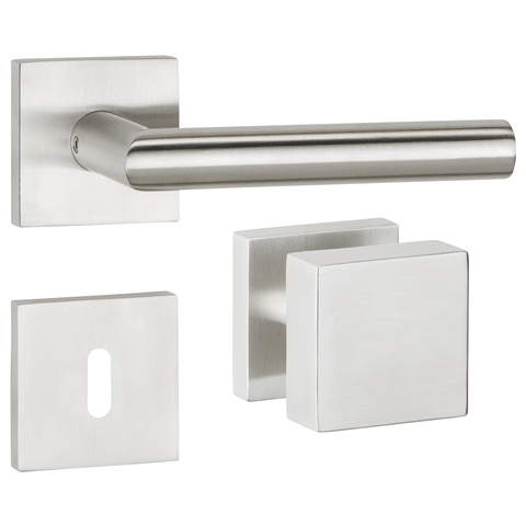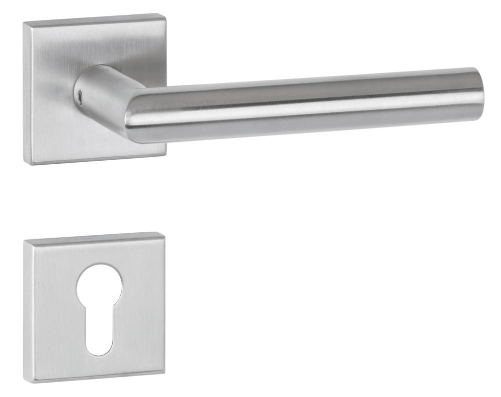Innentürgarnitur BASIC 02, mit Smart-Clip Rosetten, fest/drehbar gelagert und Rückholfeder. Technische Daten: • Drücker fest/drehbar gelagert mit Hochhaltefeder • freier Zugang zu den Befestigungssch