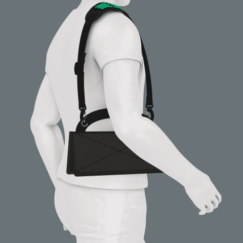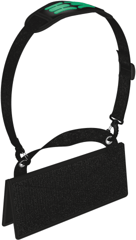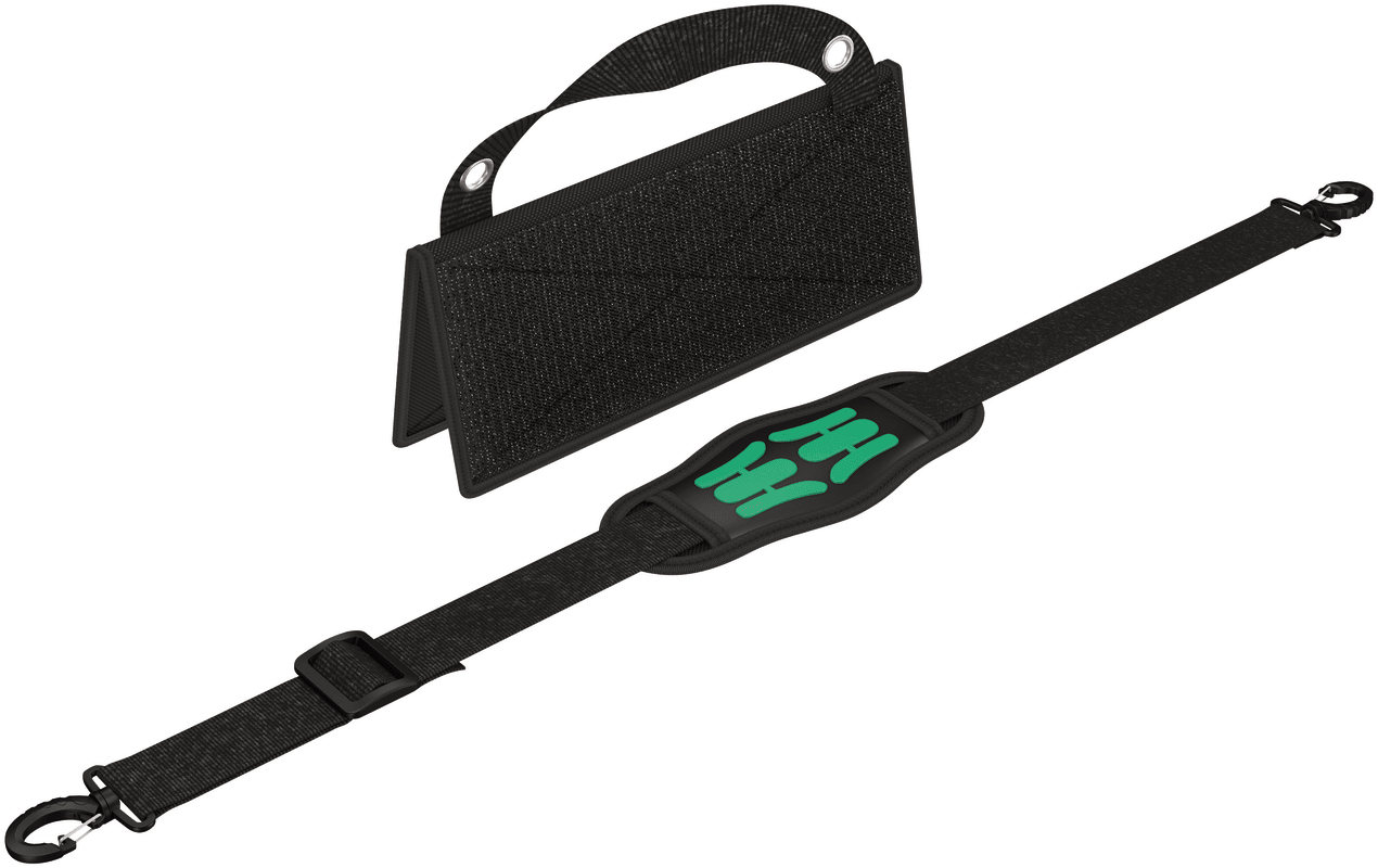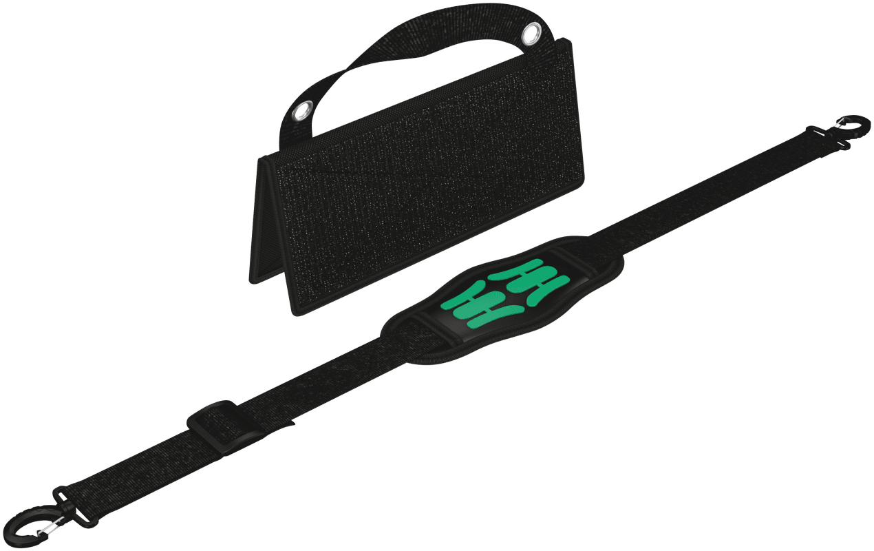 1 Werkzeug-Träger mit Klettsystem zum Ankletten von weiteren Wera 2go-Komponenten und textilen Wera Boxen und Taschen mit Klettzone, 1 Schulter-Tragegurt mit verschiebbarer breiter Polsterung, in der Länge einstellbar, abnehmbar.