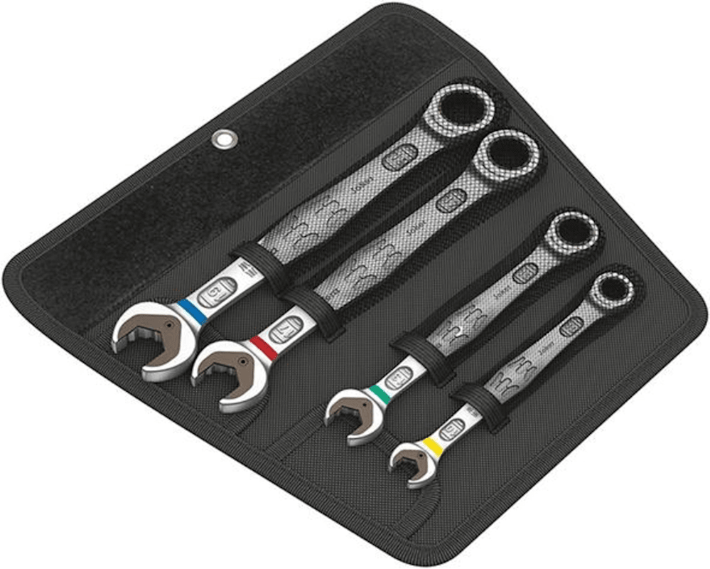 Hochwertiger Ringratschen-Maulschlüssel-Satz von Wera: Alles, was ein Schlüssel können muss. Und noch viel mehr. Schneller, besser, schöner. Eben ein echter Joker. Die neue Generation der Maul-Ringratschen-Schlüssel. 4-teiliger Satz in robuster Tasche. Für Sechskant-Schraubenköpfe bzw. -Muttern. Mit Haltefunktion durch Metallplatte im Maul, die die Gefahr des Verlierens von Schrauben und Muttern reduziert. Die auswechselbare Metallplatte im Maul sichert mit extra harten Zähnen Schrauben und Muttern und reduziert die Abrutschgefahr. Der integrierte Endanschlag kann das Abrutschen vom Schraubenkopf nach unten verhindern und ermöglicht das Aufbringen hoher Drehmomente. Die Doppelsechskantgeometrie sorgt für die formschlüssige Verbindung mit Schraube oder Mutter und damit für die Verringerung der Abrutschgefahr. Ein Rückschwenkwinkel von nur 30° auf der Maulseite vermeidet zeitintensives Wenden des Schlüssels beim Schrauben. Ratschenmechanik auf der Ringseite mit außergewöhnlich hoher Feinverzahnung von 80 Zähnen für Flexibilität auch in engen Bauräumen. Die spezielle Schmiedegeometrie sorgt für hohe Drehmomentübertragung und hohe Biegungssteifigkeit. Gefertigt aus leistungsfähigem Chrom-Molybdän-Stahl mit Nickel-Chrom Beschichtung für hohen Korrosionsschutz. Mit Werkzeugfinder "Take it easy": Farbkennzeichnung nach Größen.