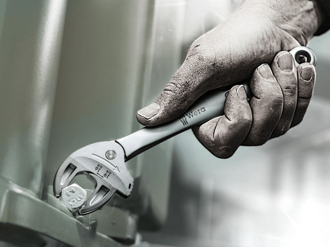 Viele Anwender wünschen sich ein universelles Schraubwerkzeug mit möglichst großem Einsatzspektrum. Ein einziges Werkzeug für mehrere metrische und zöllige Abmessungen sollte es sein. Es sollte sich automatisch auf die unterschiedlichen Schraubengrößen einstellen. Sicher zupacken, nichts beschädigen und eine hohe Arbeitsgeschwindigkeit ermöglichen. Durch die stufenlos und parallel geführten Backen werden mehrere Maulschlüssel-Einzelabmessungen ersetzt. Die benötigte Größe stellt sich beim Ansetzen an der Sechskant-Mutter oder -Schraube stufenlos von selbst ein. Der integrierte Hebelmechanismus klemmt die Sechskant-Schraube bzw. -Mutter zwischen den Backen sicher ein, was die Gefahr des Abrutschens und der Beschädigungen deutlich verringert. Für das schnelle und durchgängige Schrauben ohne Absetzen sorgt die Ratschenfunktion. Durch die Nutzung der Eckweiten-Prismen ist ein Rückschwenkwinkel von nur 30° realisierbar. Die Ein-Schenkel-Konstruktion in Verbindung mit der Ratschenfunktion und dem Eckweitenprisma ermöglicht das Arbeiten auch in engen Bauräumen. Der verstellbare Joker 6004 ist das universelle Schraubwerkzeug. Selbstjustierend. Zupackend. Ratschend.