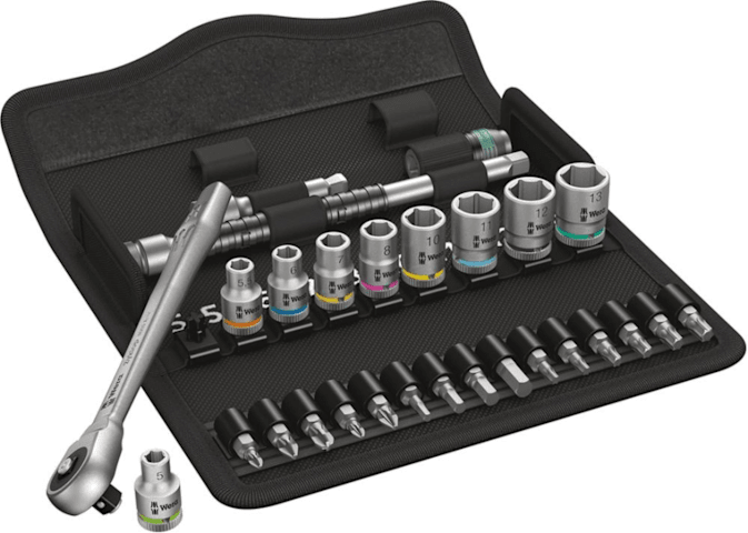 Steckschlüssel-Garnitur 1/4", Zyklop Metal, Nr. 8100 SA 7• Vollmetallknarre mit Durchsteck-4-kant, aus Chrom-Molybdän-Stahl, geschmiedet • Doppelklinkenverzahnung mit besonders kleinem Rückholwinkel