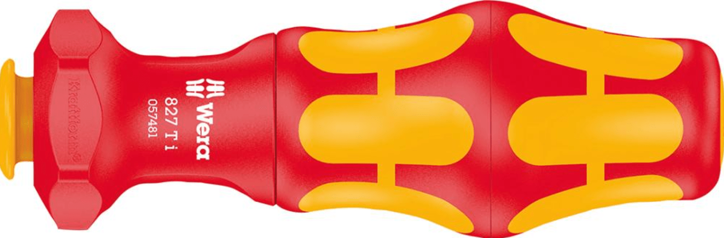 VDE-Handgriff Turbo, Nr. 827• Mehrkomponenten-Kraftform-Griff • 6-kant-Abrollschutz • Zur Aufnahme von VDE-Wechselklingen • Stückprüfung im Wasserbad bei 10000 V für sicheres Arbeiten bei zugelasse
