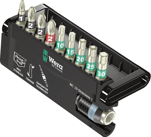 Bit-Sortiment Bit-Check 10 Stainless 1• Edelstahl • Torsionsbereich • Verhindert das Ansetzen von Fremdrost beim Verschrauben von Edelstahlschrauben • Take-it-easy-Werkzeugfinder mit Farbkennzeichn