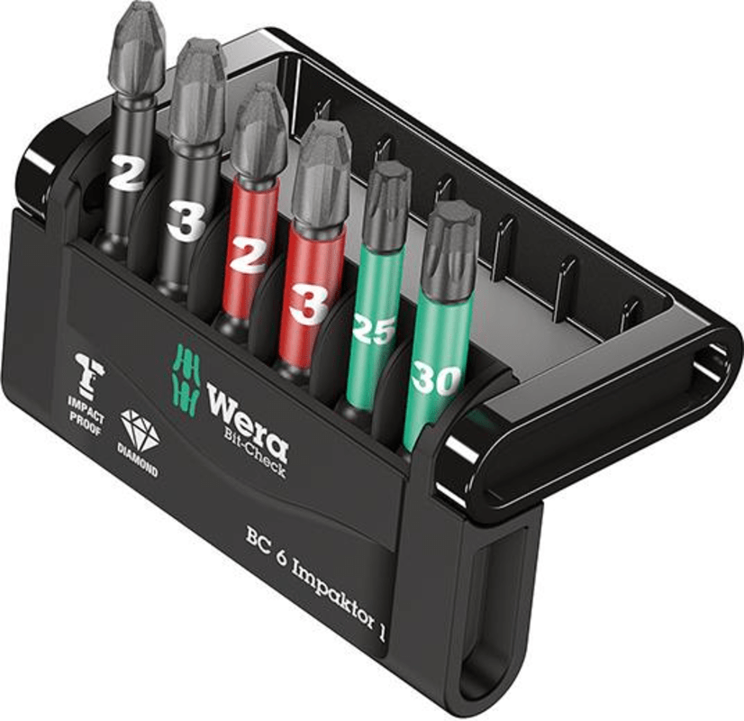 6 Wera Impaktor-Bits übersichtlich angeordnet auf engstem Raum im praktischen Bit-Check. Die Impaktor-Technologie sorgt durch bestmögliche Ausnutzung der Materialeigenschaften und durch optimal angepasste Geometrien für überdurchschnittliche Standzeiten auch bei extremen Anforderungen. Die Bitspitze ist mit winzigen Diamantpartikeln beschichtet und reduziert durch erhöhten Reibungswiderstand das Herausrutschen aus der Schraube.