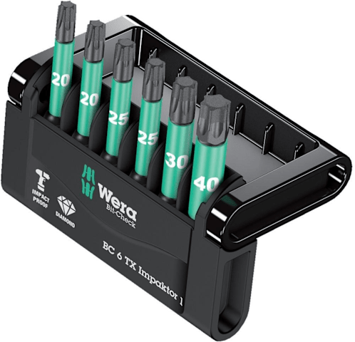 Bit-Sortiment Bit-Check 6 TX Impaktor 1• Diamantbeschichtet, für sicheren Sitz in der Schraube • Torsionsbereich • Geeignet auch für den Einsatz mit handelsüblichen Impakt-/Schlagschraubern • Take-