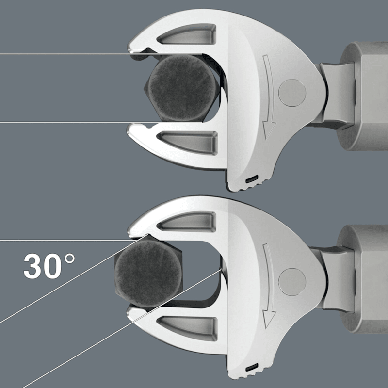 Ausführung:Selbstjustierender Maulschlüssel mit Ratschenfunktion; größenverstellbare Maulseite, parallel geführte glatte Backen; mit 30° Rückschwenkwinkel über die Eckweitenprismen im Maul