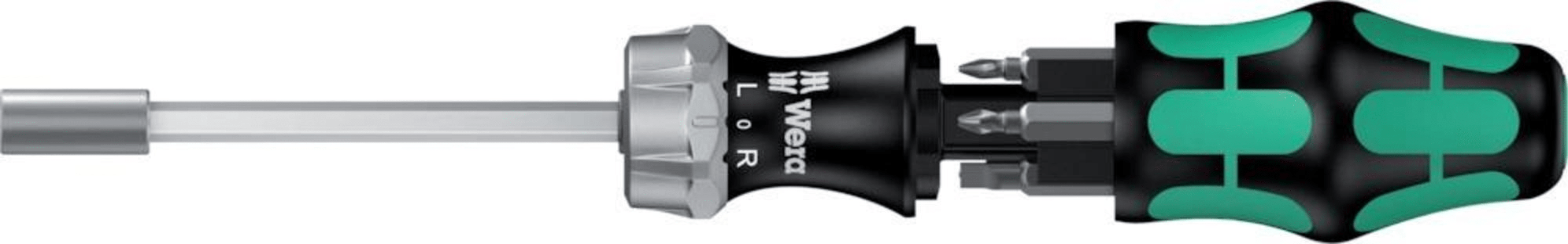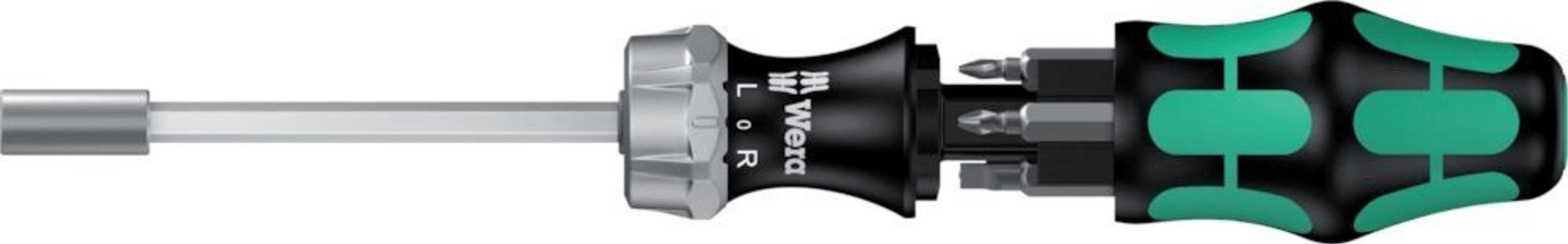 Wera Kompaktwerkzeug mit mehrkomponentigem Kraftform Griff für hohe Arbeitsgeschwindigkeiten und besonders ergonomisches Verschrauben. Integriertes Bit-Magazin im Griff. Inkl. Ratsche: Feinverzahnung für geringen Rückholwinkel, Umschaltring (rechts, fest, links), maximales Drehmoment von bis zu 50 Newtonmetern; Sechskant-Klinge mit 1/4"-Innensechskantaufnahme, Edelstahlhülse, starker Dauermagnet.