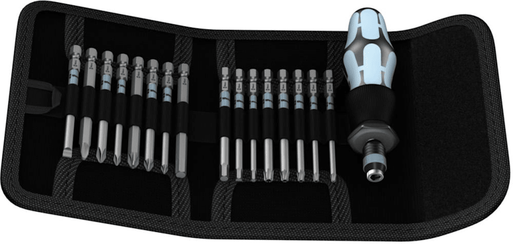 Falttasche mit 89 mm langen Bits. Inklusive Handhalter 3816 R Kraftform mit Schnellwechselfutter "Rapidaptor" und mehrkomponentigem Kraftform-Griff für ermüdungsarmes Arbeiten. Edelstahlausführung zur Vermeidung von Fremdrost. 17-teilig.