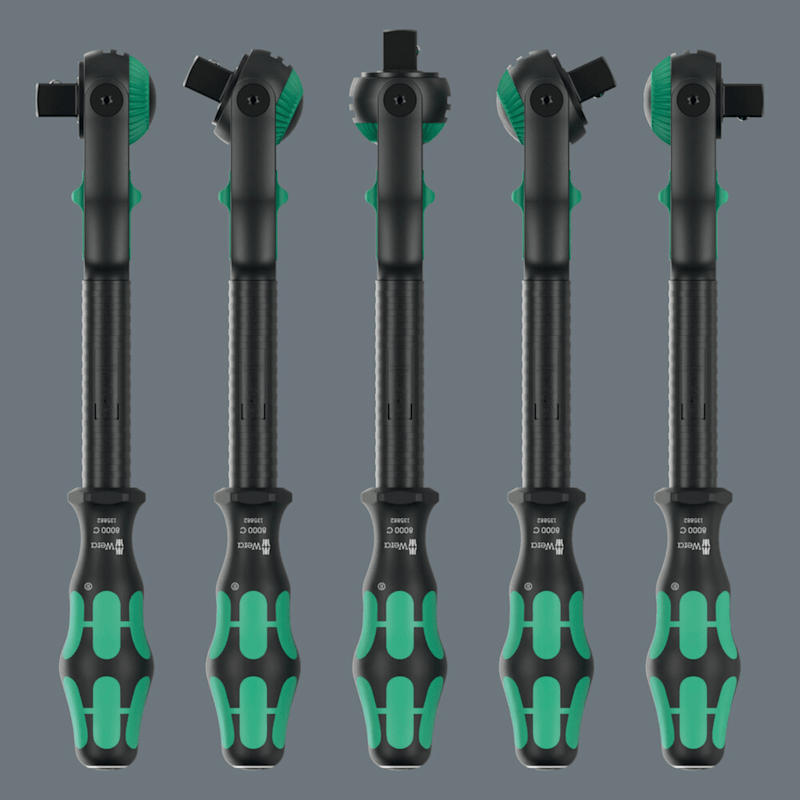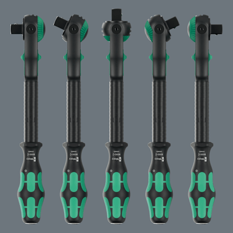 Ausführung: Schwungmassenkonstruktion und griffige Schnelldrehhülse für hohe Arbeitsgeschwindigkeit; frei schwenkbarer Knarrenkopf; definierte Stellung bei 0°, 90° nach links und rechts sowie 15° von 90° nach innen; in 0°-Stellung einsetzbar wie ein konventioneller Schraubendreher; Druckknopfauslösung; Links- /Rechtsumschaltung, feinverzahnt, kleiner Rückholwinkel von 5°