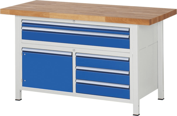 Werkbank, Serie 8000, 2 Schubladen XXL, 3 Schubladen, 1 Tür • Schweißkonstruktion: mit Gestellfüßen aus Profil-Stahlrohr (45 x 45 x 2 mm) inklusive Tiefenverstrebungen und einem kompletten Rahmen unter der Arbeitsplatte, Gestellfüße mit Antirutschnoppen und vorbereitet für die Nachrüstung einer Höhenverstellung und/oder eines Rollensatzes • Buche-Massiv-Arbeitsplatte: Stärke 40 mm, geölte Oberfläche • Schubladen: 1x 60 mm, 1x 120 mm, Größe XXL, Innenmaß B x T 1055 x 560 mm, Tragkraft 50 kg, Auszug 100 % 3x 120 mm, Größe L, Innenmaß B x T 490 x 560 mm, Tragkraft 100 kg, Auszug ca. 90 % • Tür: 1x 360 mm, selbstzuziehende Federscharniere, Öffnungswinkel 180° • Ergo-Script® Griffleisten: mit Beschriftungsstreifen, integriert • Zentralverschluss: Schloss mit 2 Schlüsseln • Flächenlast: max. 1250 kg • Umweltfreundliche Pulverbeschichtung: RAL 7035 lichtgrau und RAL 5010 enzianblau Lieferung: Erfolgt komplett montiert.