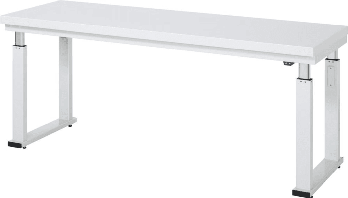 Werkbank, Serie adlatus 600, Hartlaminat-Platte • Mit Hartlaminat-Platte: Stärke: 40 mm • Flächenlast: max. 600 kg • Funktionsunterbau: mit Hubsäulen (Prüfung gem. EN 60335-1) inklusive Steuereinheit, Anschlusskabel und Bedienelement mit Auf-/Ab-Taster • Verstellweg: 38 mm/s (ohne Zuladung) • Einschaltdauer: 10 % (6 Minuten pro Stunde oder 2 Minuten Dauerbetrieb bei Volllast) • Stromverbrauch im Standby-Modus: nur 0,1 W • Kompletter Rahmen: zur Aufnahme der Arbeitsplatte • Kufen: mit Nivellierfüßen • Umweltfreundliche Pulverbeschichtung: RAL 7035 lichtgrau Lieferung: Erfolgt komplett montiert.