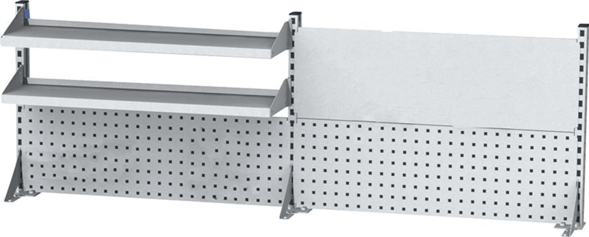 Multi-Wand-Aufbau, Breite 2000 mm, 2 Lochwände, 2 Fachböden, 1 Magnetwand • Lochplatte: Lochung 10 x 10 mm, quadratisch, Abstand 38 zu 38 mm • 3 Tragsäulen 650 mm • 2 Lochwände 1000 x 302 mm • 2 Fachböden 1000 x 220 mm • 1 Magnetwand 1000 x 302 mm • Aufbau mit Tragsäulen geeignet ab Plattenstärke 40 mm