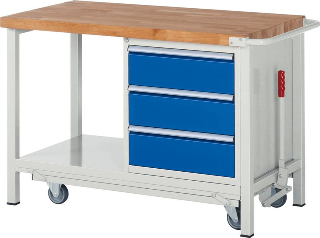 Mobile Werkbank, absenkbar, 3 Schubladen, 1 Stahlblech-Ablageboden • Schweißkonstruktion: mit Gestellfüßen aus Profil-Stahlrohr (45 x 45 x 2 mm) inklusive Tiefenverstrebungen • Buche-Massiv-Arbeitsplatte: Stärke 40 mm, geölte Oberfläche • Stahlblech-Ablageboden: Höhe 40 mm, Tiefe 650 mm, Fachhöhe 620 mm • Schubladen: 3x 180 mm, Größe L, Innenmaß B x T 490 x 560 mm, Tragkraft 100 kg, Auszug ca. 90 % • Absenkbar: Fahrwerk mit 2 Bock- und 2 Lenkrollen, das mit einer Exzenterhebelbedienung (rechts) abgesenkt werden kann, Flächenlast max. 1250 kg bei stationärer Anwendung bzw. 450 kg bei ausgefahrenem Fahrwerk • Ergo-Script® Griffleiste: inkl. Beschriftungsstreifen • Zentralverschluss: Schloss mit 2 Schlüsseln • Umweltfreundliche Pulverbeschichtung: Gestelle/Gehäuse RAL 7035 lichtgrau, Schubladen/Türen: RAL 5010 enzianblau Lieferung: Erfolgt komplett montiert.
