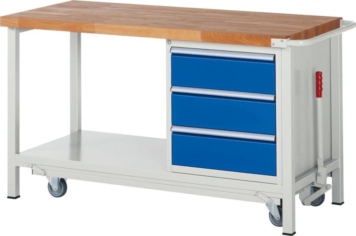 Mobile Werkbank, absenkbar, 3 Schubladen, 1 Stahlblech-Ablageboden • Schweißkonstruktion: mit Gestellfüßen aus Profil-Stahlrohr (45 x 45 x 2 mm) inklusive Tiefenverstrebungen • Buche-Massiv-Arbeitsplatte: Stärke 40 mm, geölte Oberfläche • Stahlblech-Ablageboden: Höhe 40 mm, Tiefe 650 mm, Fachhöhe 620 mm • Schubladen: 3x 180 mm, Größe L, Innenmaß B x T 490 x 560 mm, Tragkraft 100 kg, Auszug ca. 90 % • Absenkbar: Fahrwerk mit 2 Bock- und 2 Lenkrollen, das mit einer Exzenterhebelbedienung (rechts) abgesenkt werden kann, Flächenlast max. 1250 kg bei stationärer Anwendung bzw. 450 kg bei ausgefahrenem Fahrwerk • Ergo-Script® Griffleiste: inkl. Beschriftungsstreifen • Zentralverschluss: Schloss mit 2 Schlüsseln • Umweltfreundliche Pulverbeschichtung: Gestelle/Gehäuse RAL 7035 lichtgrau, Schubladen/Türen: RAL 5010 enzianblau Lieferung: Erfolgt komplett montiert.