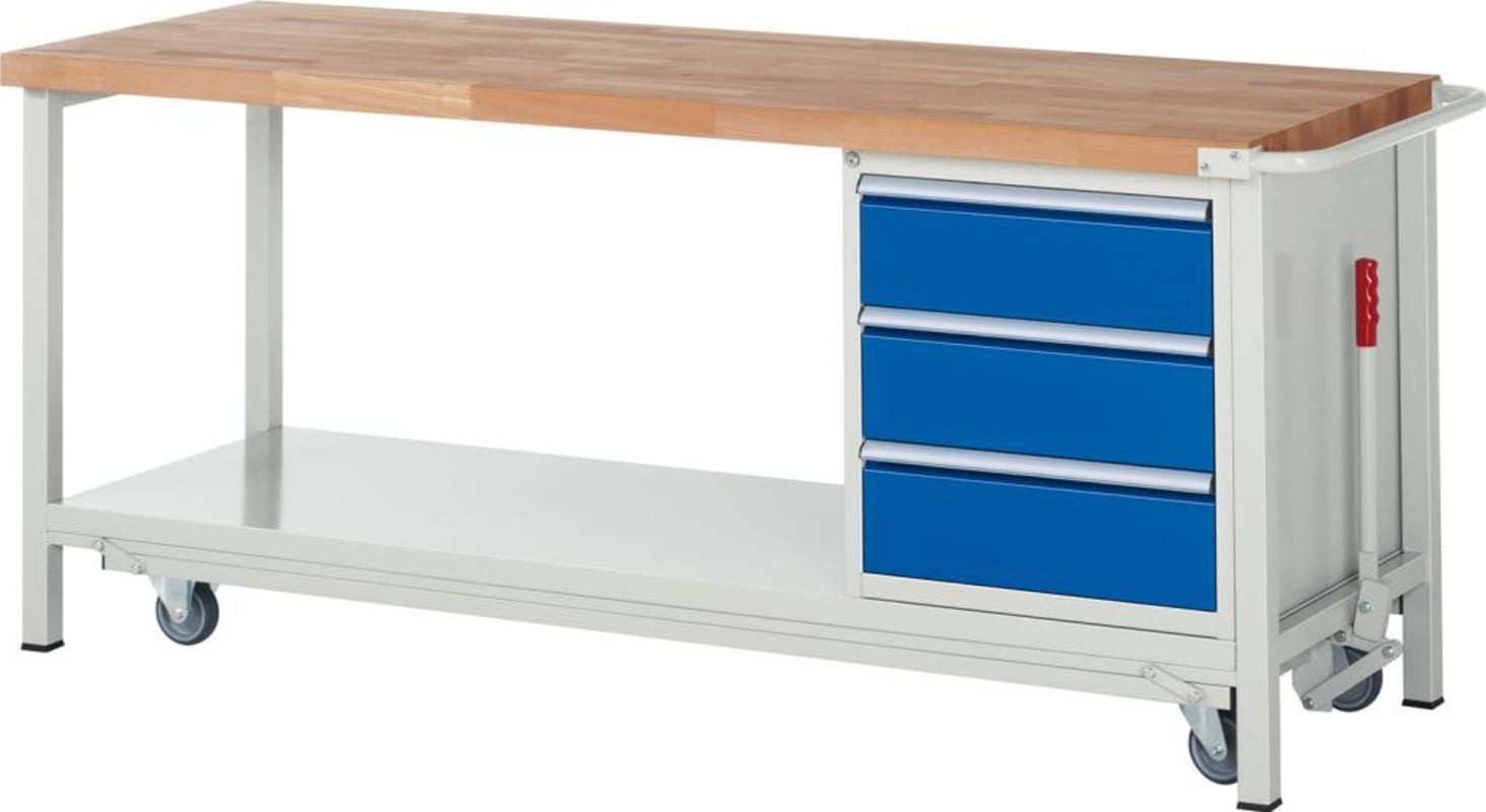 Mobile Werkbank, absenkbar, 3 Schubladen, 1 Stahlblech-Ablageboden • Schweißkonstruktion: mit Gestellfüßen aus Profil-Stahlrohr (45 x 45 x 2 mm) inklusive Tiefenverstrebungen • Buche-Massiv-Arbeitsplatte: Stärke 40 mm, geölte Oberfläche • Stahlblech-Ablageboden: Höhe 40 mm, Tiefe 650 mm, Fachhöhe 620 mm • Schubladen: 3x 180 mm, Größe L, Innenmaß B x T 490 x 560 mm, Tragkraft 100 kg, Auszug ca. 90 % • Absenkbar: Fahrwerk mit 2 Bock- und 2 Lenkrollen, das mit einer Exzenterhebelbedienung (rechts) abgesenkt werden kann, Flächenlast max. 1250 kg bei stationärer Anwendung bzw. 450 kg bei ausgefahrenem Fahrwerk • Ergo-Script® Griffleiste: inkl. Beschriftungsstreifen • Zentralverschluss: Schloss mit 2 Schlüsseln • Umweltfreundliche Pulverbeschichtung: Gestelle/Gehäuse RAL 7035 lichtgrau, Schubladen/Türen: RAL 5010 enzianblau Lieferung: Erfolgt komplett montiert.