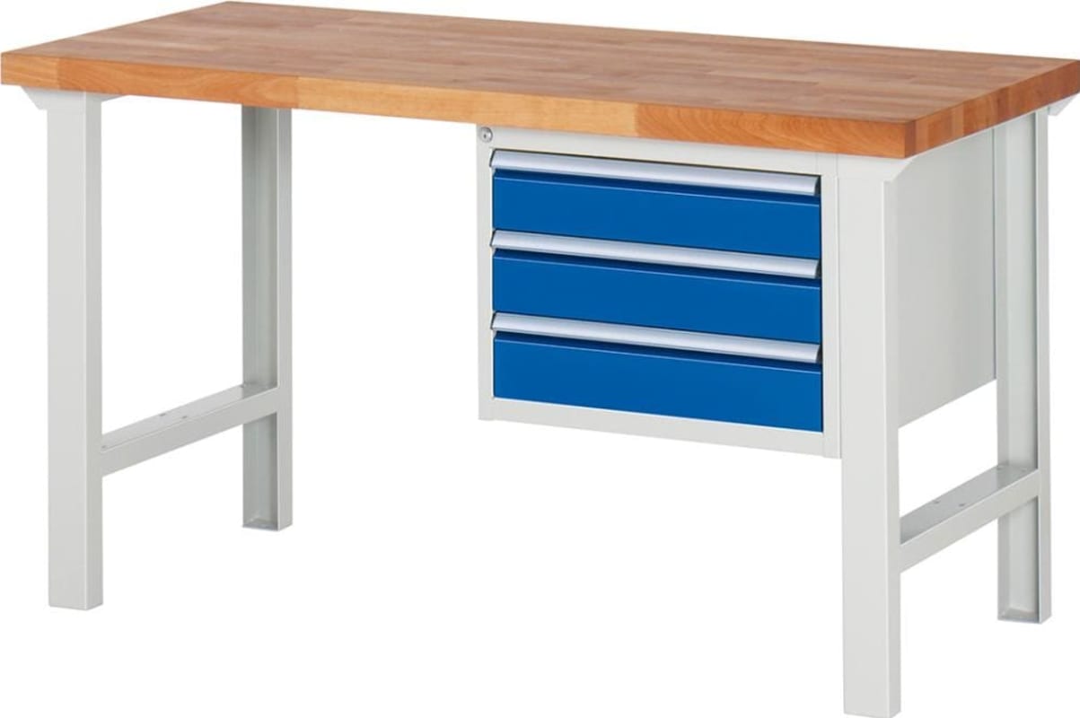 Werkbank, Serie 7000, 3 Schubladen • Baukastensystem: Gestellfüße aus C-Profil (70 x 50 x 2 mm) mit 120 mm breiter Auflagefläche (oben) in Kombination mit Unterbau-Containern (B x T 580 x 650 mm) • Buche-Massiv-Arbeitsplatte: Stärke 40 mm, geölte Oberfläche • Schubladen: 3x 120 mm, Größe L, Innenmaß B x T 490 x 560 mm, Tragkraft 100 kg, Auszug ca. 90 % • Ergo-Script® Griffleisten: mit integrierten Beschriftungsstreifen • Zentralverschluss: Schloss mit 2 Schlüsseln • Flächenlast: 750 kg • Umweltfreundliche Pulverbeschichtung: Gestelle/Gehäuse: RAL 7035 lichtgrau, Schubladen RAL 5010 enzianblau Lieferung: Erfolgt komplett montiert.