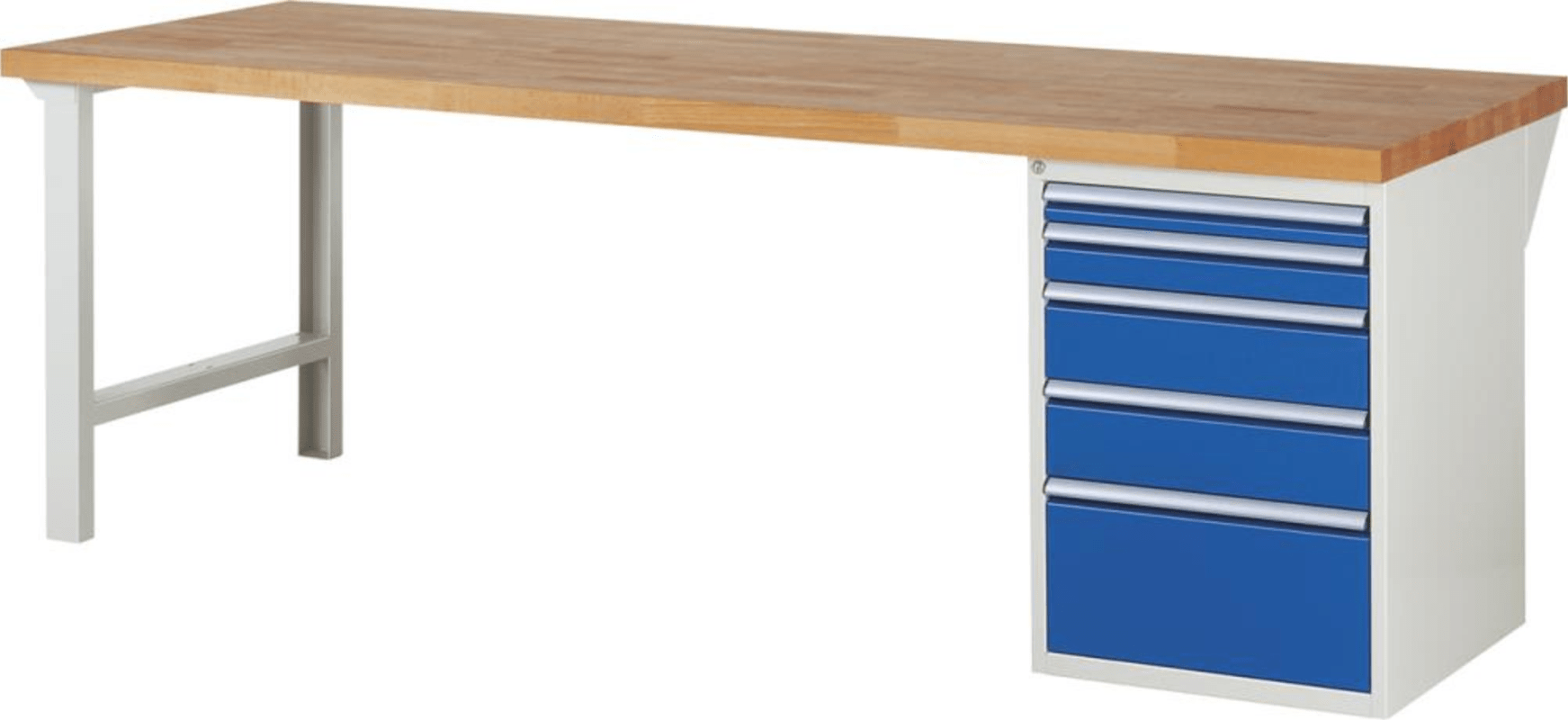Werkbank, Serie 7000, 5 Schubladen • Baukastensystem: Gestellfüße aus C-Profil (70 x 50 x 2 mm) mit 120 mm breiter Auflagefläche (oben) in Kombination mit Unterbau-Containern (B x T 580 x 650 mm) • Buche-Massiv-Arbeitsplatte: Stärke 40 mm, geölte Oberfläche • Schubladen: 1x 60, 1x 90, 2x 150, 1x 270 mm, Größe L, Innenmaß BxT 490 x 560 mm, Tragkraft 100 kg, Auszug ca. 90 % • Ergo-Script® Griffleisten: mit integrierten Beschriftungsstreifen • Zentralverschluss: Schloss mit 2 Schlüsseln • Flächenlast: 1000 kg • Umweltfreundliche Pulverbeschichtung: Gestelle/Gehäuse: RAL 7035 lichtgrau, Schubladen RAL 5010 enzianblau Lieferung: Erfolgt komplett montiert.