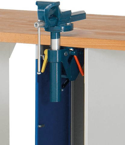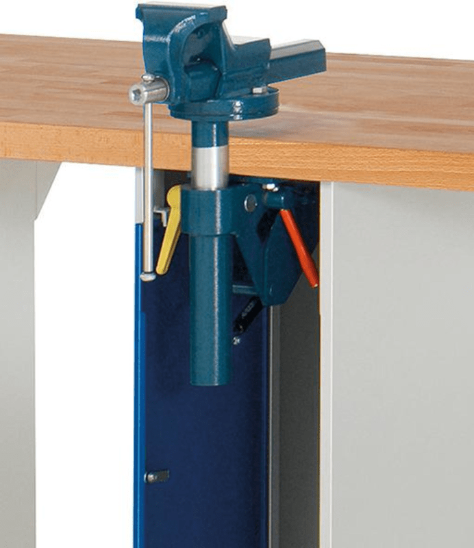 Werkbank, Serie 7000, 10 Schubladen, 1 Schraubstockschrank • Baukastensystem: Gestellfüße aus C-Profil (70 x 50 x 2 mm) mit 120 mm breiter Auflagefläche (oben) in Kombination mit Unterbau-Containern (B x T 580 x 650 mm) • Buche-Massiv-Arbeitsplatte: Stärke 40 mm, geölte Oberfläche • Schubladen: 2x 60, 2x 90, 4x 150, 2x 270 mm, Größe L, Innenmaß B x T 490 x 560 mm, Tragkraft 100 kg, Auszug ca. 90 % • Ergo-Script® Griffleisten: mit integrierten Beschriftungsstreifen • Zentralverschluss: Schloss mit 2 Schlüsseln • Schraubstockschrank mit Schraubstock 120 mm und Klapplift, einschwenkbar • Flächenlast: 1000 kg • Umweltfreundliche Pulverbeschichtung: Gestelle/Gehäuse: RAL 7035 lichtgrau, Schubladen RAL 5010 enzianblau Lieferung: Erfolgt komplett montiert.