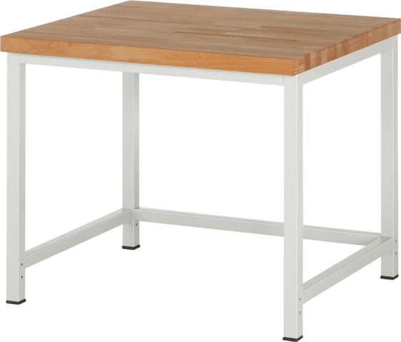 Werkbank, Serie 8000, ohne Schublade • Schweißkonstruktion: mit Gestellfüßen aus Profil-Stahlrohr (45 x 45 x 2 mm) inklusive Tiefenverstrebungen und einem kompletten Rahmen unter der Arbeitsplatte, Gestellfüße mit Antirutschnoppen und vorbereitet für die Nachrüstung einer Höhenverstellung und/oder eines Rollensatzes • Buche-Massiv-Arbeitsplatte: Stärke 40 mm, geölte Oberfläche • Flächenlast: max. 1250 kg • Umweltfreundliche Pulverbeschichtung: RAL 7035 lichtgrau Lieferung: Erfolgt komplett montiert.