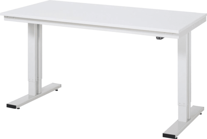 Werktisch, Serie adlatus 300, Melamin-Platte • Mit Melamin-Platte: Stärke: 22 mm • Flächenlast: max. 300 kg • Funktionsunterbau: mit Hubsäulen (Prüfung gem. EN 60335-1) inklusive Steuereinheit, Anschlusskabel und Bedienelement mit Auf-/Ab-Taster • Verstellweg: 38 mm/s (ohne Zuladung) • Einschaltdauer: 10 % (6 Minuten pro Stunde oder 2 Minuten Dauerbetrieb bei Volllast) • Stromverbrauch im Standby-Modus: nur 0,1 W • Kompletter Rahmen: zur Aufnahme der Arbeitsplatte • Kufen: mit Nivellierfüßen • Umweltfreundliche Pulverbeschichtung: RAL 7035 lichtgrau Lieferung: Erfolgt komplett montiert.