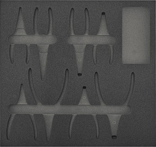 Werkzeugmodul Sicherungsringzangen, lee • 2-farbige Schaumstoffeinlage, fehlende Werkzeuge auf einen Blick erkenne Zur Aufnahme von 2 Sicherungsringzangen für Innenringe, gerade, J 1; J 2 Sicherungsringzangen für Innenringe, 90° gewinkelt, J 11; J 2 2 Sicherungsringzangen für Außenringe, gerade, A 1; A 2 Sicherungsringzangen für Außenringe, 90° gewinkelt, A 11; A 21