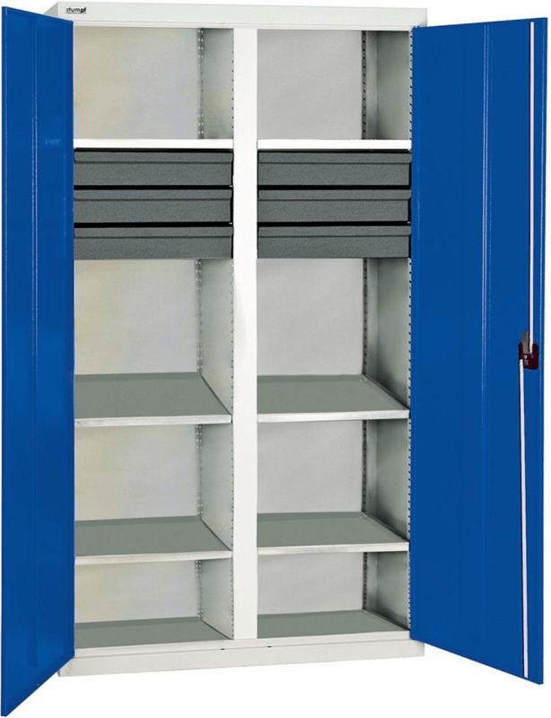 Meesenburg Artikelbezeichnung: WERKZEUGSCHRANK 1000X500X1800MM RAL7035/ 5010 6 SCHUBLADEN 6 WANNEN 3004274