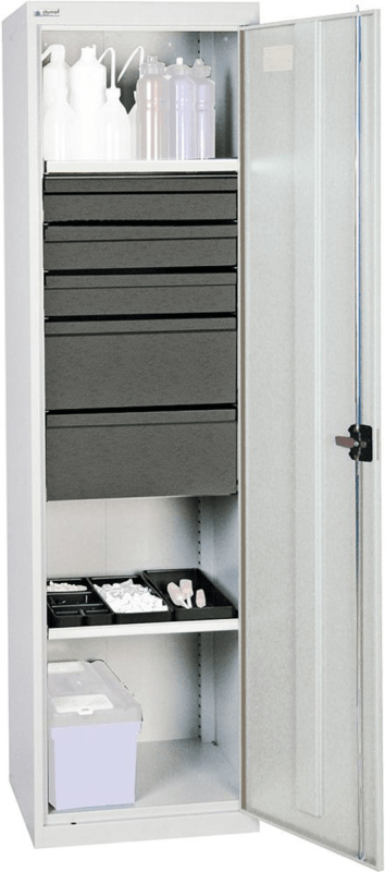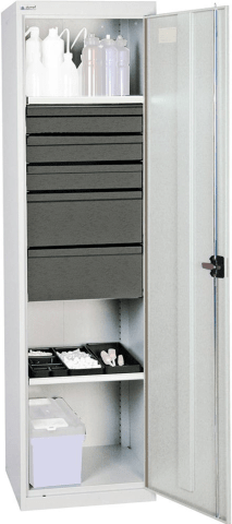 Werkzeug- und Materialschrank Serie 3000, 3 Schubladen 100 mm, 2 Schubladen 200 mm, 2 Wannenböden • Geeignet für alle betrieblichen Bereiche • Material: Qualitätsfeinblech, verschweißt • Oberfläche: pulverbeschichtet, unempfindlich, langlebig, schlag- und kratzfest • Zentralverschluss: Drehgriff-Dreipunktverriegelung, integriertes Zylinderschloss • Schubladen: Teleskopschienen, Einzelauszug 100 %, im Raster von 25 mm höhenverstellbar • Wannen: verzinkt, Teleskopschienen, im Raster von 25 mm höhenverstellbar