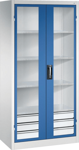 Schwerlastschrank, mit Flügeltüren und Schubladenblock unten • Material: Stahlblech mit hochwertiger Einbrennbeschichtung • Sichtfenster: 3-mm-Acrylglas, fest verklebt, verdeckte Schließstangen • Tür