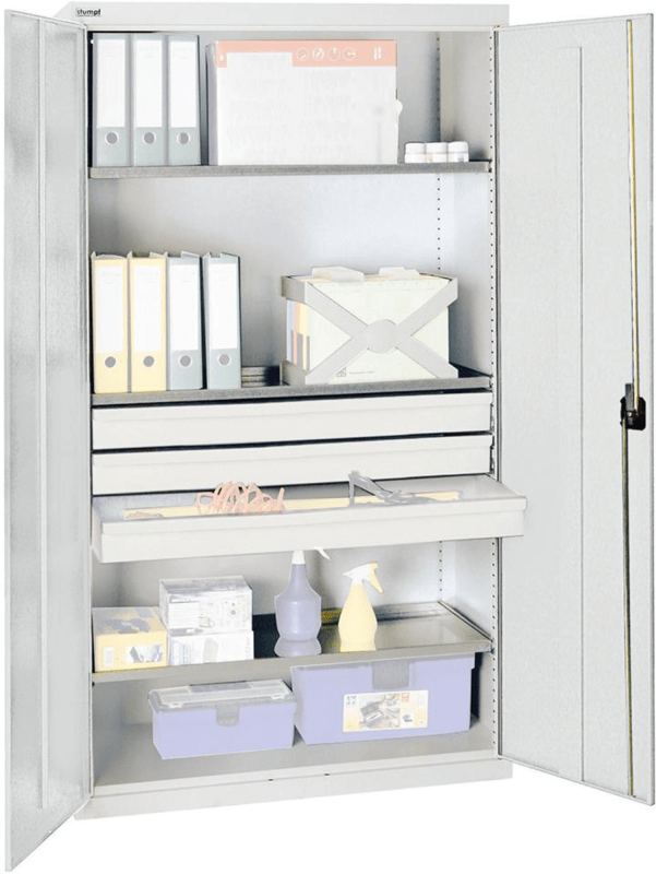 Werkzeug- und Materialschrank Serie 2000, 3 Schubladen, 3 Fachböden • Geeignet für Produktionsbereiche • Material: Qualitätsfeinblech, verschweißt • Oberfläche: pulverbeschichtet, unempfindlich, langlebig, schlag- und kratzfest • Material Gehäuse: Qualitäts-Stahlblech, verschweißt • Zentralverschluss: Drehgriff-Dreipunktverriegelung, integriertes Zylinderschloss • Schubladen: 3x Großraum, Teleskopschienen, Einzelauszug 100 %, im Raster von 25 mm höhenverstellbar • Wannen: verzinkt, im Raster von 25 mm höhenverstellbar