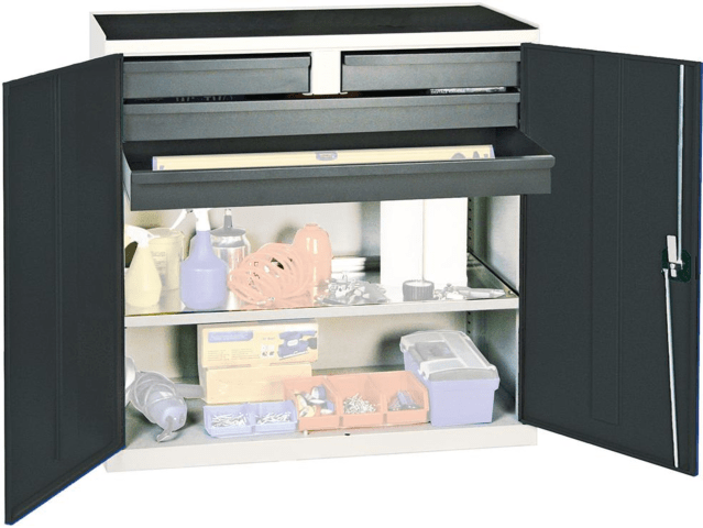Werkzeug- und Materialschrank Serie 3000, 2 Schubladen 100 mm, 2 Schubladen 100 mm durchgehend, 1 Wannenboden • Geeignet für alle betrieblichen Bereiche • Material: Qualitätsfeinblech, verschweißt •
