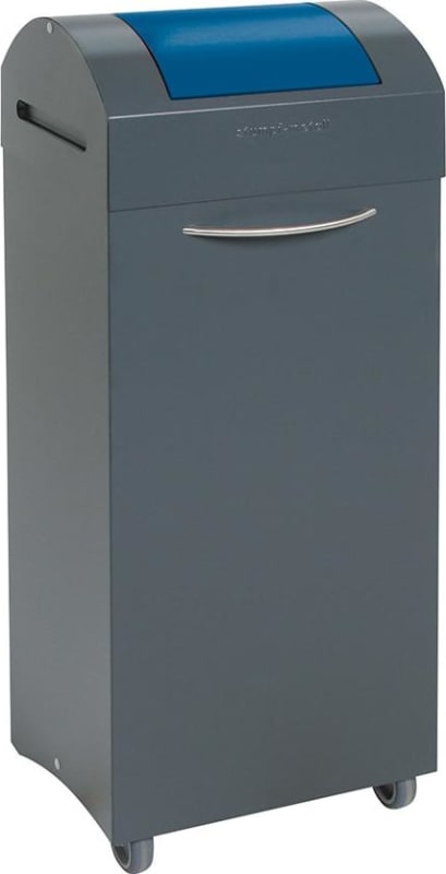 Wertstoffsammler, mit Schwingdeckel • Material: Stahlblech, verzinkt • Oberfläche: pulverbeschichtet • Griff: aus Edelstahl • Mit Rollen • Feuerhemmend und selbstlöschend