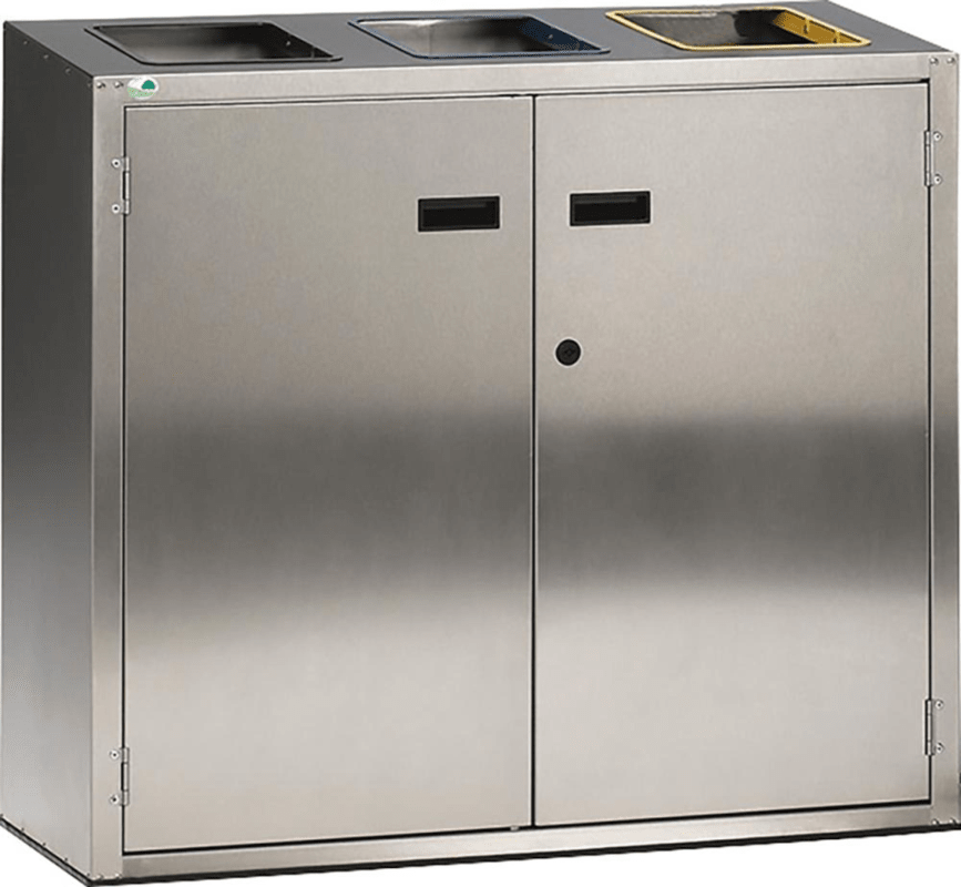 Wertstoffsortiersystem • Material: Edelstahl • Doppeltüren: mit Doppelbartschloss und Griffmulden • Farbige Einwurföffnungen: anthrazit, blau und gelb • Niveauausgleich: über 4 verstellbaren Füße