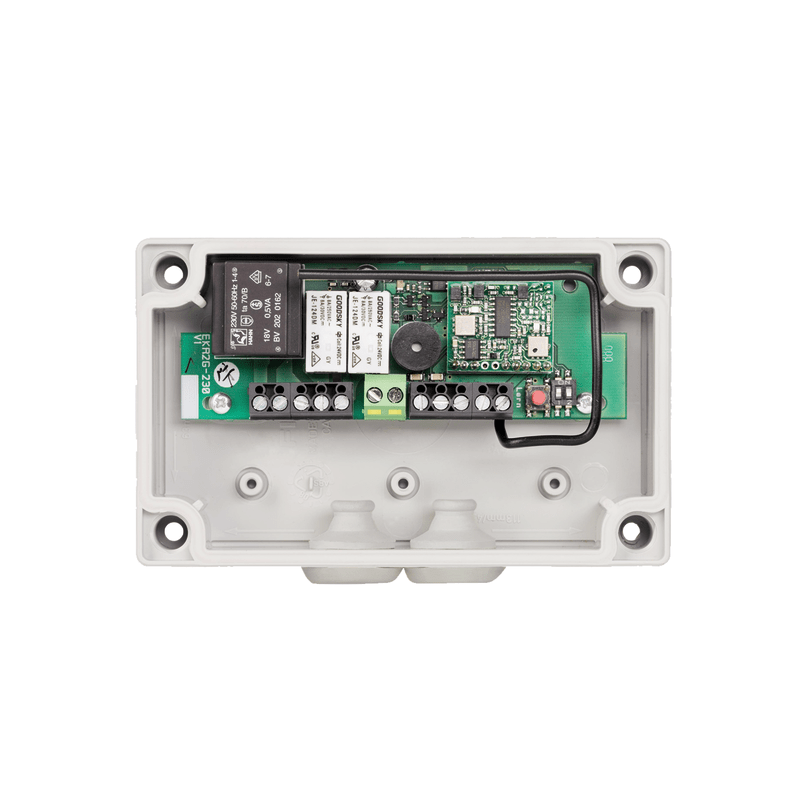 Funkempfangsmodul im IP-54 Gehäuse. Mit 2 Ausgängen, Relaiskontakt 5 A. Schutzart IP 54.