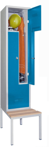 Z-Garderobenschrank, mit Sitzbank • Gehäuse: Stahlblech • Mit Sitzbankuntergestell: Höhe 2100, Tiefe 500/800 mm • Türen: einschlagend mit Verstärkungstaschen, Lüftungsschlitzen und Drehriegelverschluss • Innen-Ausstattung: je Abteil 1 Kleiderstange mit 3 Schiebehaken • Lackierung: zweifarbig RAL 7035 lichtgrau/RAL 5012 lichtblau