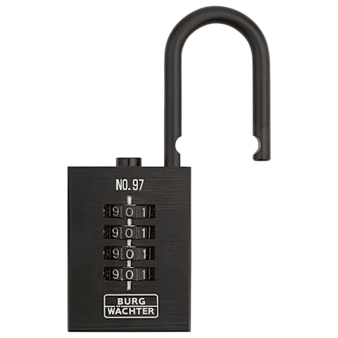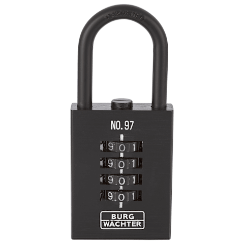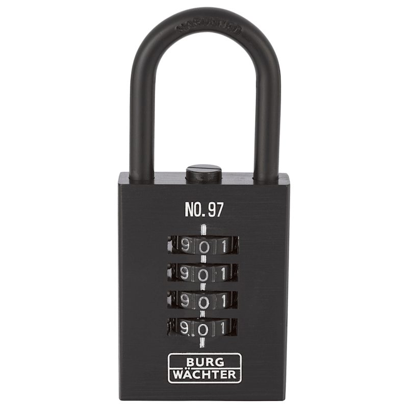 Das BURG-WÄCHTER Zahlen-Vorhangschloss Numero 97 aus solider, schwerer Guss-Qualität ist mit einem hochwertigen Korrosionsschutz versehen. Der Bügel und Teile des Schließwerks sind gehärtet. Die 4-ste