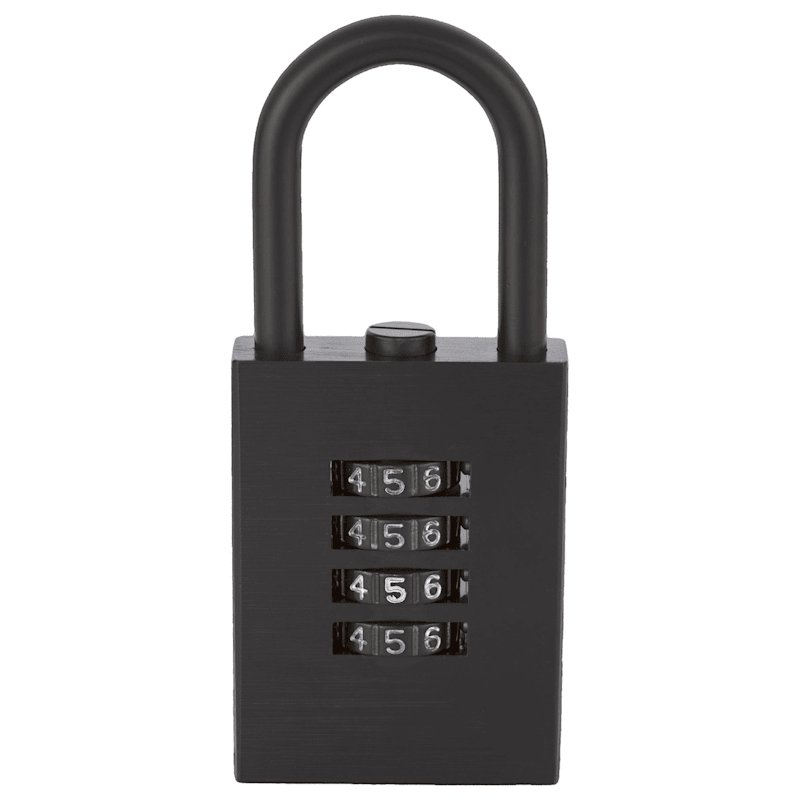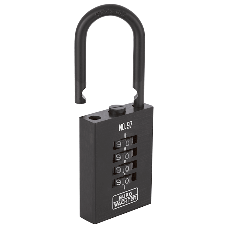 Das BURG-WÄCHTER Zahlen-Vorhangschloss Numero 97 aus solider, schwerer Guss-Qualität ist mit einem hochwertigen Korrosionsschutz versehen. Der Bügel und Teile des Schließwerks sind gehärtet. Die 4-ste