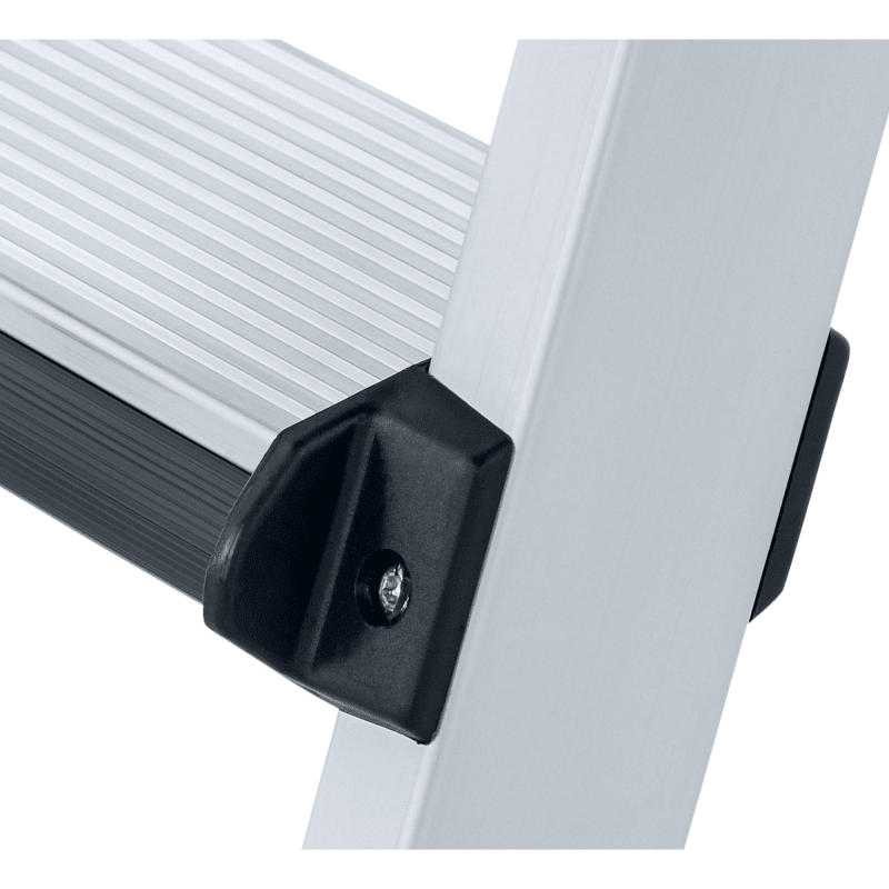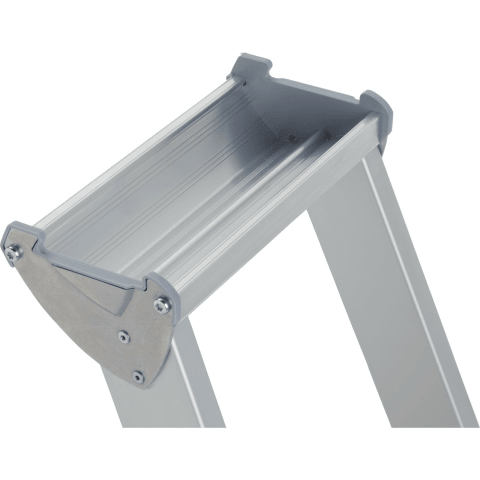 Schonung fürs Schienbein: hoher Arbeitskomfort durch gepolsterte Stufen. 80 mm tiefe Stufen mit gepolsterter Stufen-Vorderkante. Holme abriebfest eloxiert. Standplattform aus Alu-Strangpressprofil (300 mm × 250 mm) für sicheren und bequemen Stand auch bei längeren Arbeiten. Praktische Ablageschale aus Aluminium für Kleinteile und Werkzeuge. Spreizsicherung durch hochfeste Perlongurte.