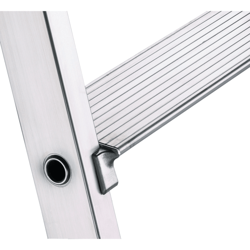 Flexibles Steiggerät für sicheren Aufstieg und Arbeiten bis 3,65 Metern Höhe. Patentierte Stufenkonstruktion: robust, stabil, dauerhaft, gebördelte Stufen-Holm-Verbindung. Stufen mit 80 mm tiefen Auft