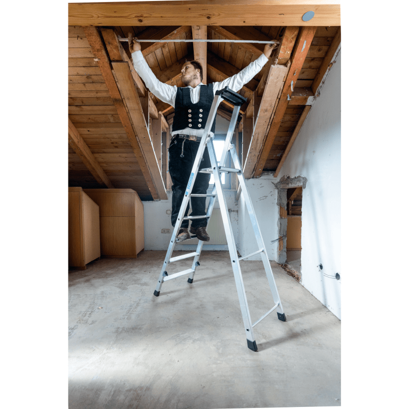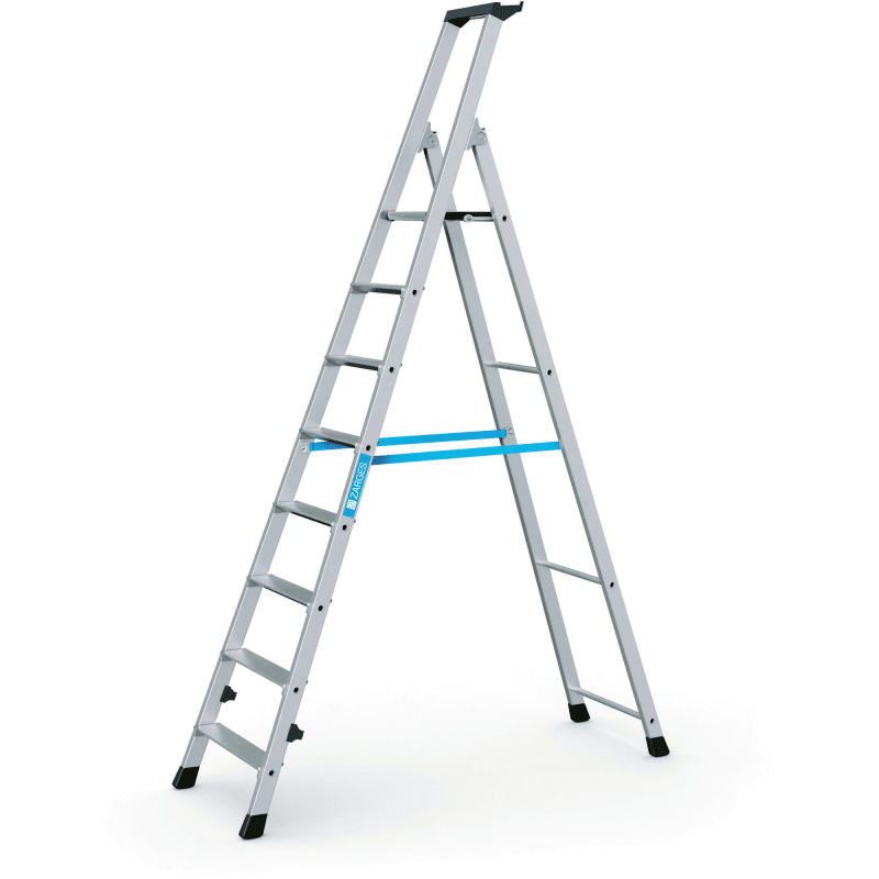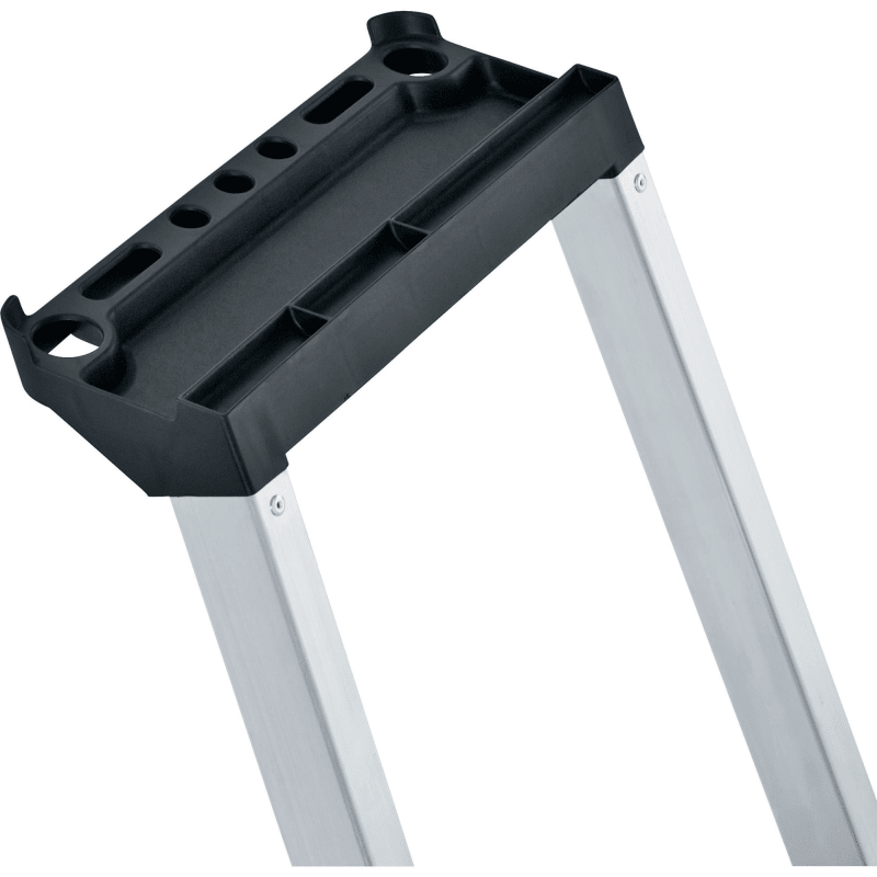 Der Klassiker für sicheren Stand und bequemes Arbeiten mit praktischer Ablageschale und hochstabiler, patentierter Stufen-Holm-Verbindung. Stufen mit 80 mm tiefen Auftrittsflächen. Großflächige Standp